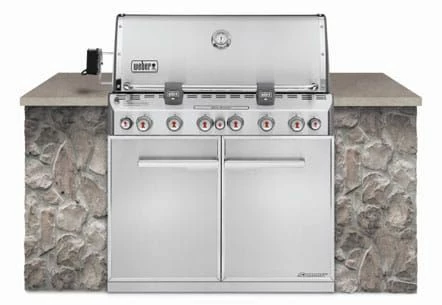 - Stainless steel shroud with polished handle and trim, a center-mounted thermometer and accent-colored, cast aluminum end caps